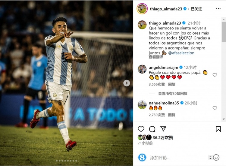 阿爾馬達(dá)社媒曬出自己慶祝進(jìn)球的照片,配文:“身穿最美麗的球衣再次進(jìn)球的感覺是多么美妙,感謝所有來支持我們的阿根廷球迷,永遠(yuǎn)團(tuán)結(jié)一致。”