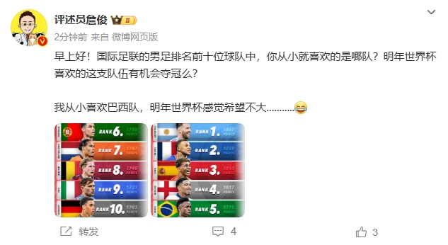 3月23日訊 詹俊更新社媒盤點了FIFA前10隊伍,你認為誰最有希望拿世界杯?