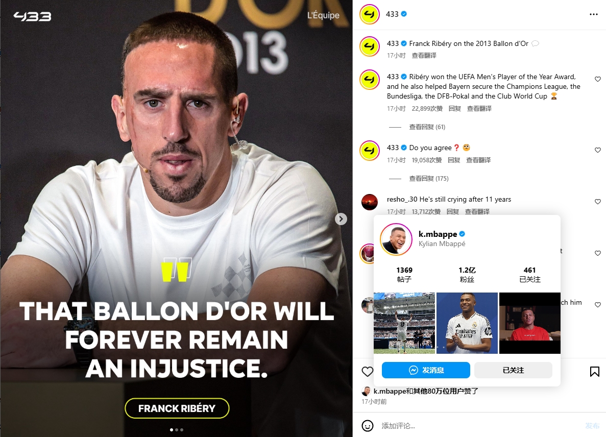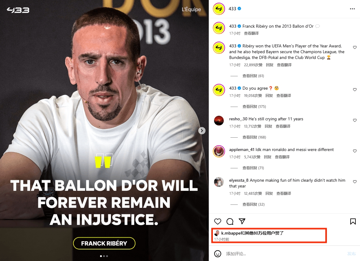 《433》昨日在ins轉(zhuǎn)載了這一報道,而姆巴佩點(diǎn)贊了這條ins。