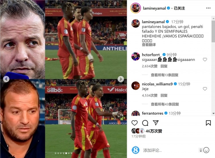 亞馬爾進(jìn)球后做出把球褲拉低的動(dòng)作,賽后他在社交媒體上曬出自己的賽場(chǎng)照,以及范德法特的照片,并寫道:“球褲拉低、打進(jìn)一球、點(diǎn)球失手、晉級(jí)半決賽。哈哈哈,西班牙加油!”