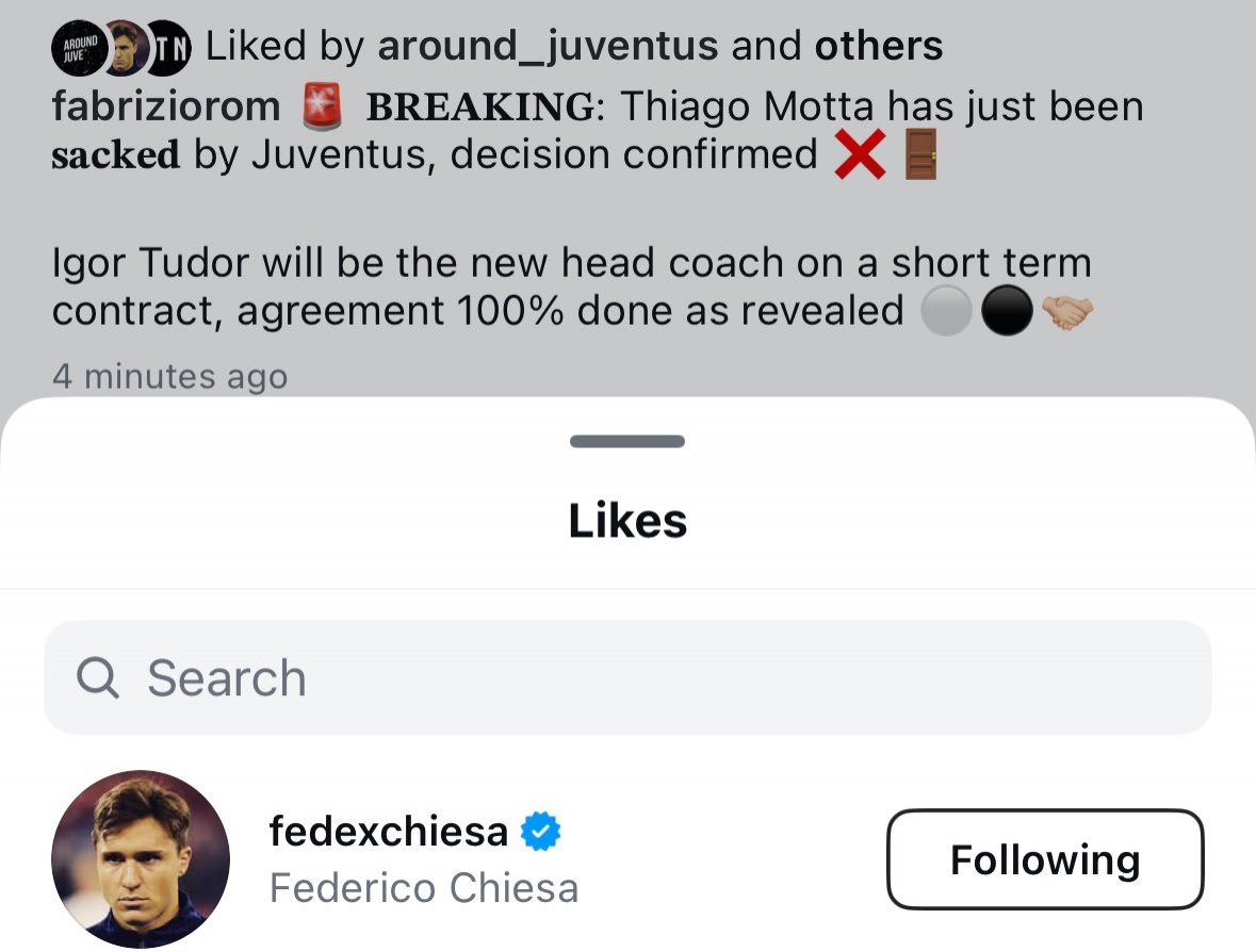 3月24日訊 尤文官宣莫塔下課,在此之前,羅馬諾先一步確認(rèn)下課消息。當(dāng)時(shí)羅馬諾的消息發(fā)出僅4分鐘,基耶薩就點(diǎn)贊了動(dòng)態(tài)。
