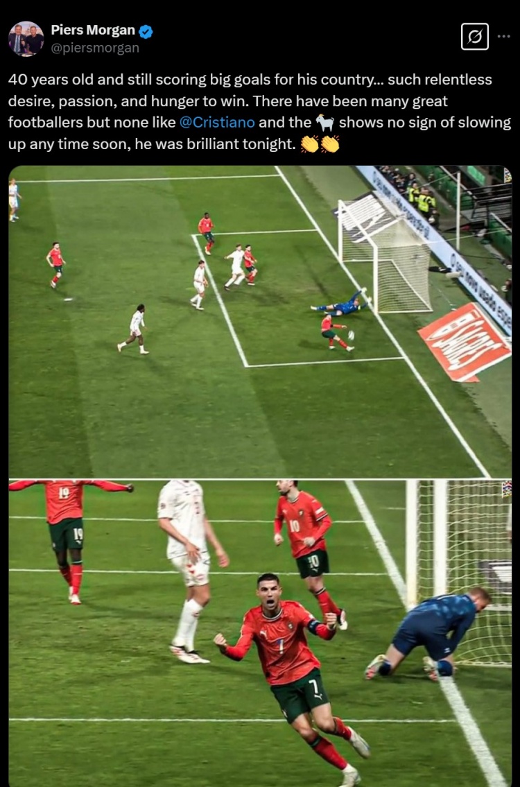 摩根寫道:40歲了,依然能為國家隊取得關(guān)鍵進球……他彰顯了如此不懈的渴望、激情和對勝利的饑餓感。偉大的球員有很多,但沒有一個能像C羅一樣。并且,GOAT(歷史最佳球員)沒有任何跡象表明他會很快放慢腳步,他今晚表現(xiàn)得非常出色。