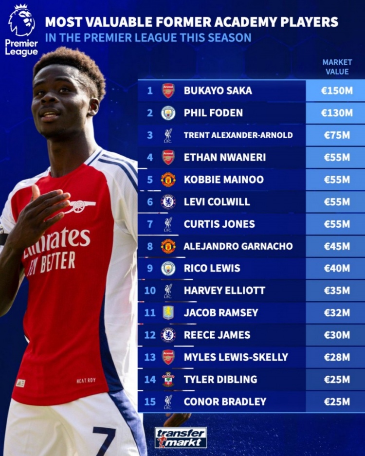 3月20日訊 德轉(zhuǎn)此前更新了英超球員身價(jià),并盤點(diǎn)了本賽季出自球隊(duì)青訓(xùn)的球員中身價(jià)最高榜單,其中薩卡居首,福登次席,具體如下: