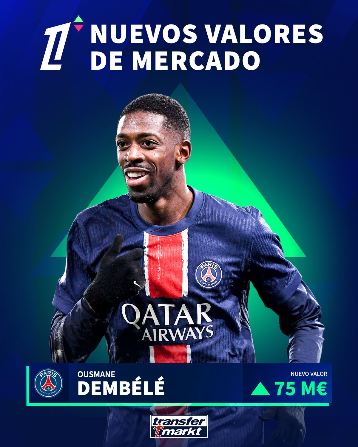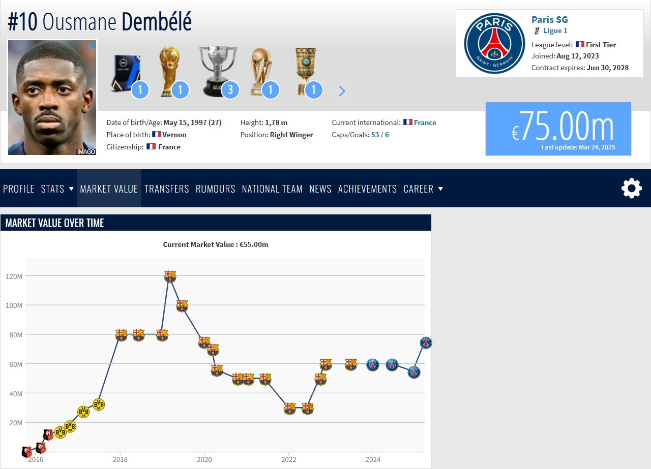這是登貝萊自2019年12月以來,首次達到7500萬歐的身價水平。雖然距離巔峰時期1.2億歐的數(shù)字仍有差距,但這已經(jīng)是他4年多里的身價新高。