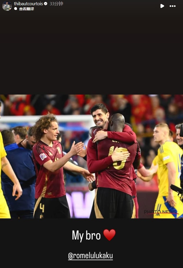 本場比賽,盧卡庫貢獻了梅開二度,賽后庫爾圖瓦曬照并寫道:“我的兄弟??@盧卡庫”