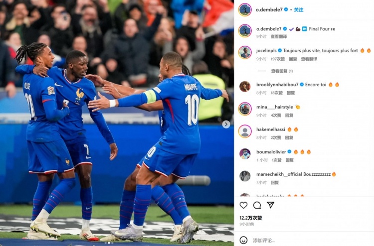 而取得進球的登貝萊也曬出和隊友相擁慶祝的合照并表示:“??