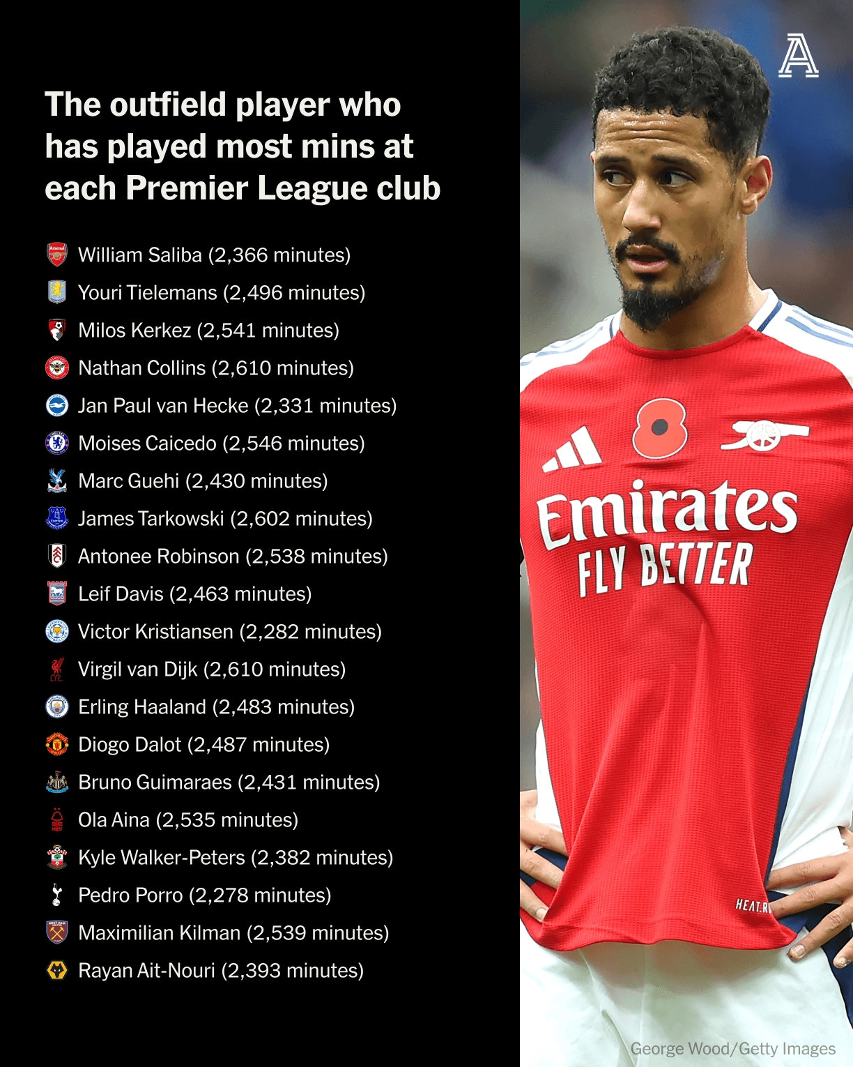 03月24日訊 The Athletic統(tǒng)計(jì)了本賽季英超各隊(duì)出場時(shí)間最多的外場(非門將)球員,薩利巴、范迪克、哈蘭德、達(dá)洛特、凱塞多在列。