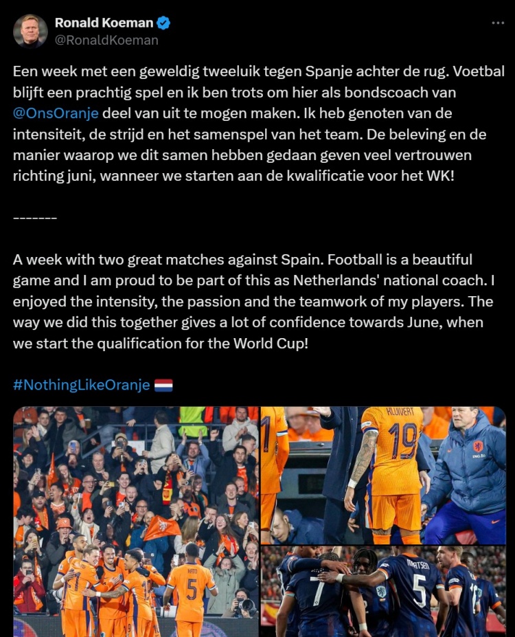 3月25日訊 荷蘭在歐國聯(lián)八強(qiáng)戰(zhàn)經(jīng)歷點(diǎn)球大戰(zhàn)不敵西班牙,主帥科曼在今日通過社媒發(fā)文。