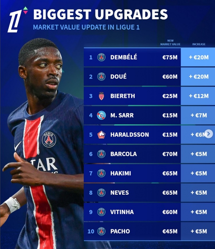 3月25日訊 《轉(zhuǎn)會市場》已經(jīng)更新了法甲球員身價,并列出了升值最多榜單,巴黎7將在列。