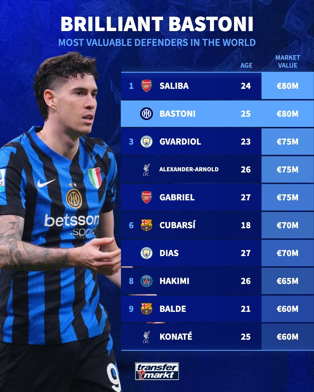 03月26日訊 德轉(zhuǎn)更新數(shù)據(jù),最新足壇后衛(wèi)身價排行榜出爐。巴斯托尼升至8000萬歐,并列第一。