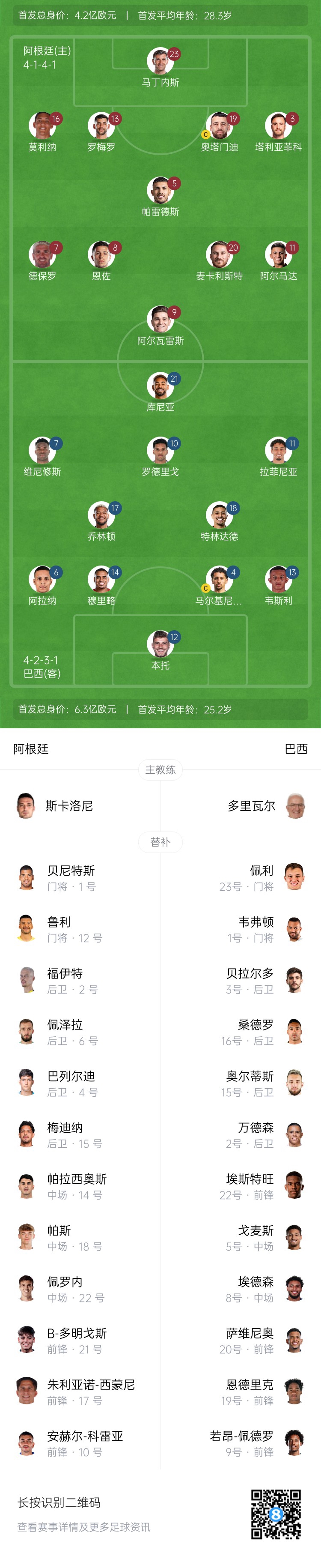阿根廷首發(fā):23-馬丁內(nèi)斯、16-莫利納、13-羅梅羅、19-奧塔門迪、3-塔利亞菲科、7-德保羅、5-帕雷德斯、20-麥卡利斯特、8-恩佐、11-阿爾馬達(dá)、9-阿爾瓦雷斯