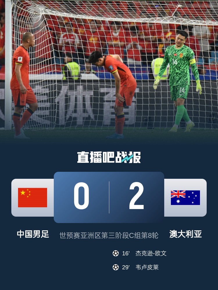 中國(guó)男足主場(chǎng)迎戰(zhàn)澳大利亞。黃政宇滑倒送禮+王大雷黃油手致丟球,國(guó)足主場(chǎng)0-2不敵澳大利亞,國(guó)足3連敗+連續(xù)2場(chǎng)遭零封。