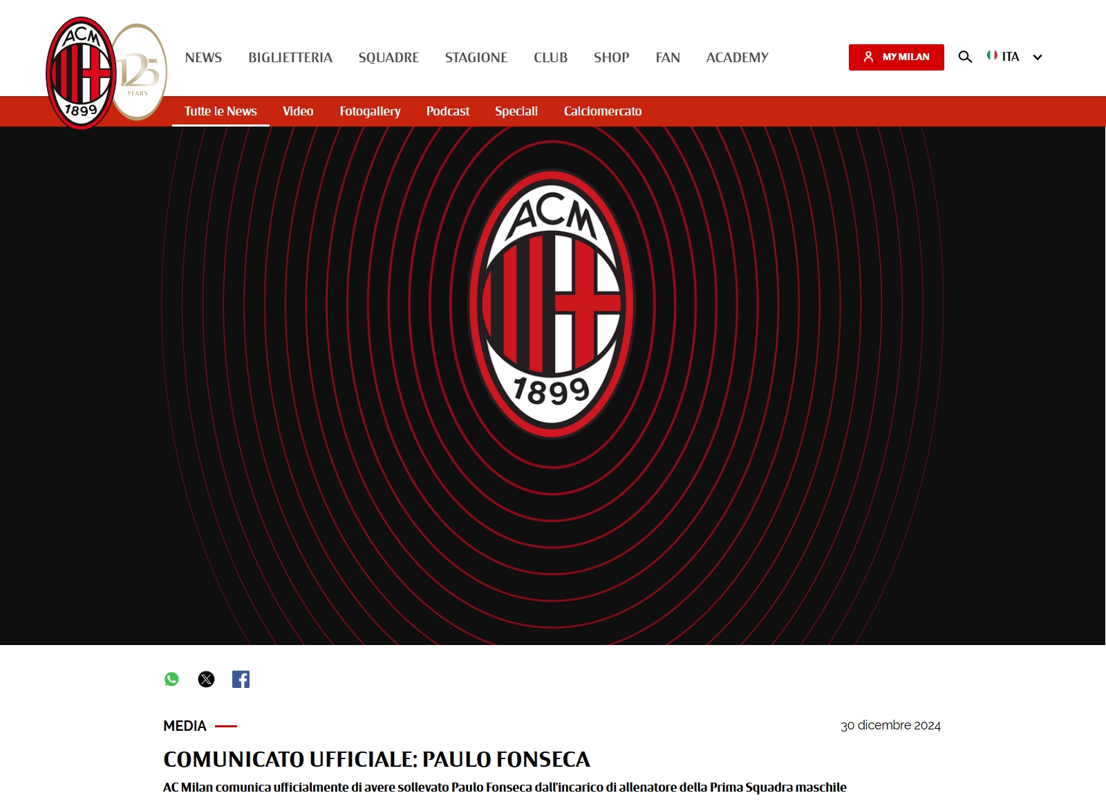 AC米蘭正式宣布解除保羅-豐塞卡的一線隊(duì)主教練職務(wù)。俱樂部感謝保羅展現(xiàn)出的高度專業(yè)精神,并祝愿他未來一切順利。