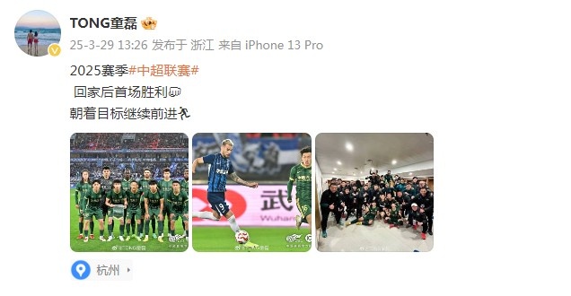 3月29日訊 在中超聯(lián)賽第3輪中,浙江隊(duì)客場4-0大勝武漢三鎮(zhèn),本場也是浙江隊(duì)在本賽季的首勝。比賽結(jié)束轉(zhuǎn)天,童磊更新微博,慶祝球隊(duì)取勝。