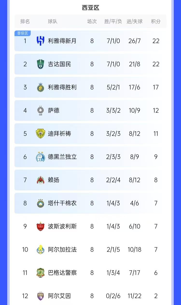 其中利雅得新月首回合0-1落敗但是次回合干脆利落4-0解決戰(zhàn)斗,利雅得勝利首回合0-0打平次回合同樣3-0輕松拿下,吉達國民則是兩回合直接雙殺對手晉級。此外這三隊也是聯(lián)賽階段西亞區(qū)的前三名,積分斷層領(lǐng)先。