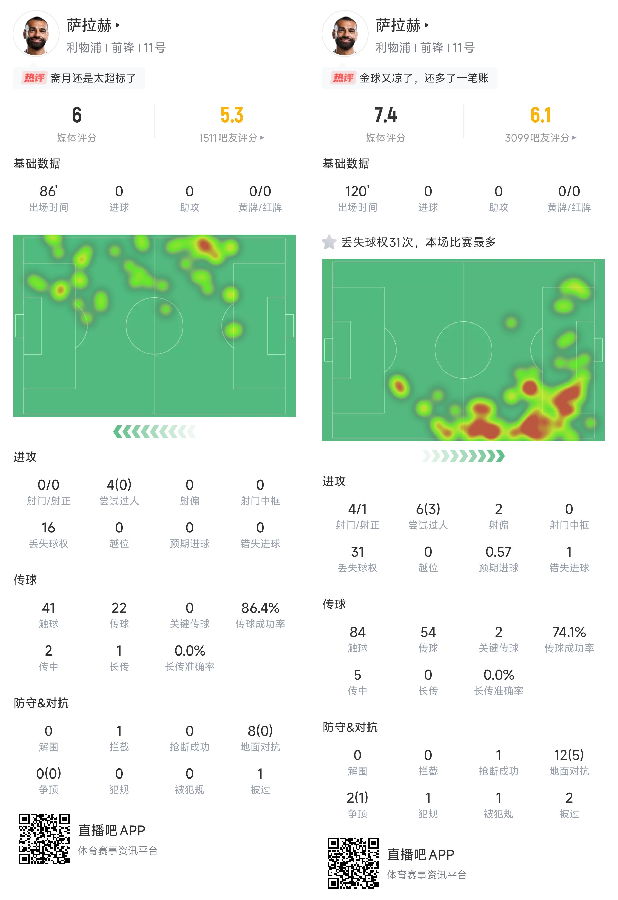 薩拉赫在兩回合的表現(xiàn)中都不算好。首回合埃及法老多項數(shù)據(jù)掛零,甚至可以說是極差,第86分鐘的時候被換下。次回合薩拉赫狀態(tài)轉(zhuǎn)好,但是仍不佳。本場他打滿全場并在點球大戰(zhàn)罰進(jìn),賽中4射1正,過人6次成功3次,對抗14次成功6次,觸球84次丟失球權(quán)31次……