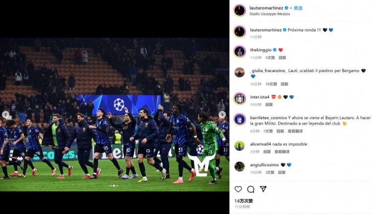 勞塔羅曬出全隊(duì)賽后奔向球迷的慶祝照,并配文:“晉級(jí)下一輪!”