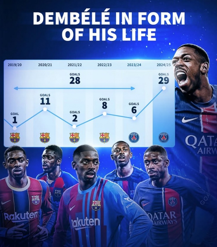 德轉(zhuǎn)數(shù)據(jù)統(tǒng)計顯示,登貝萊本賽季已經(jīng)打進29球,而他此前5個賽季在俱樂部的總進球數(shù)也才28球。