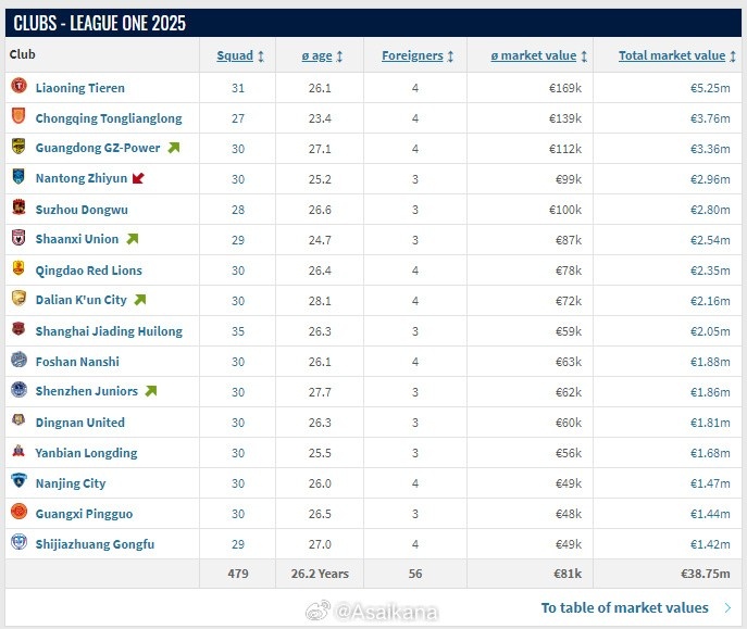 中甲聯(lián)賽各隊(duì)名單已在轉(zhuǎn)會(huì)市場(chǎng)更新。一線隊(duì)總身價(jià)最高的是遼寧鐵人,為525萬(wàn)歐元,后面依次是重慶銅梁龍(376萬(wàn)歐元)、廣東廣州豹(336萬(wàn)歐元)、南通支云(296萬(wàn)歐元)、蘇州東吳(280萬(wàn)歐元)、陜西聯(lián)合(254萬(wàn)歐元)、青島紅獅(235萬(wàn)歐元)、大連鯤城(216萬(wàn)歐元)、上海嘉定匯龍(205萬(wàn)歐元)、佛山南獅(188萬(wàn)歐元)、深圳青年人(186萬(wàn)歐元)、定南贛聯(lián)(181萬(wàn)歐元)、延邊龍鼎(168萬(wàn)歐元)、南京城市(147萬(wàn)歐元)、廣西平果(144萬(wàn)歐元)、石家莊功夫(142萬(wàn)歐元)。重慶銅梁龍是平均年齡最小的球隊(duì),為23.4歲;大連鯤城平均年齡最大,為28.1歲。