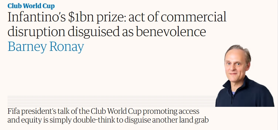 對此衛(wèi)報(bào)記者Barney Ronay撰文對世俱杯進(jìn)行抨擊,認(rèn)為這一賽事龐大的獎(jiǎng)金總數(shù)看似很美好,但對足球生態(tài)存在負(fù)面影響,更是將其稱為“披著善意外衣的商業(yè)顛覆行為”。