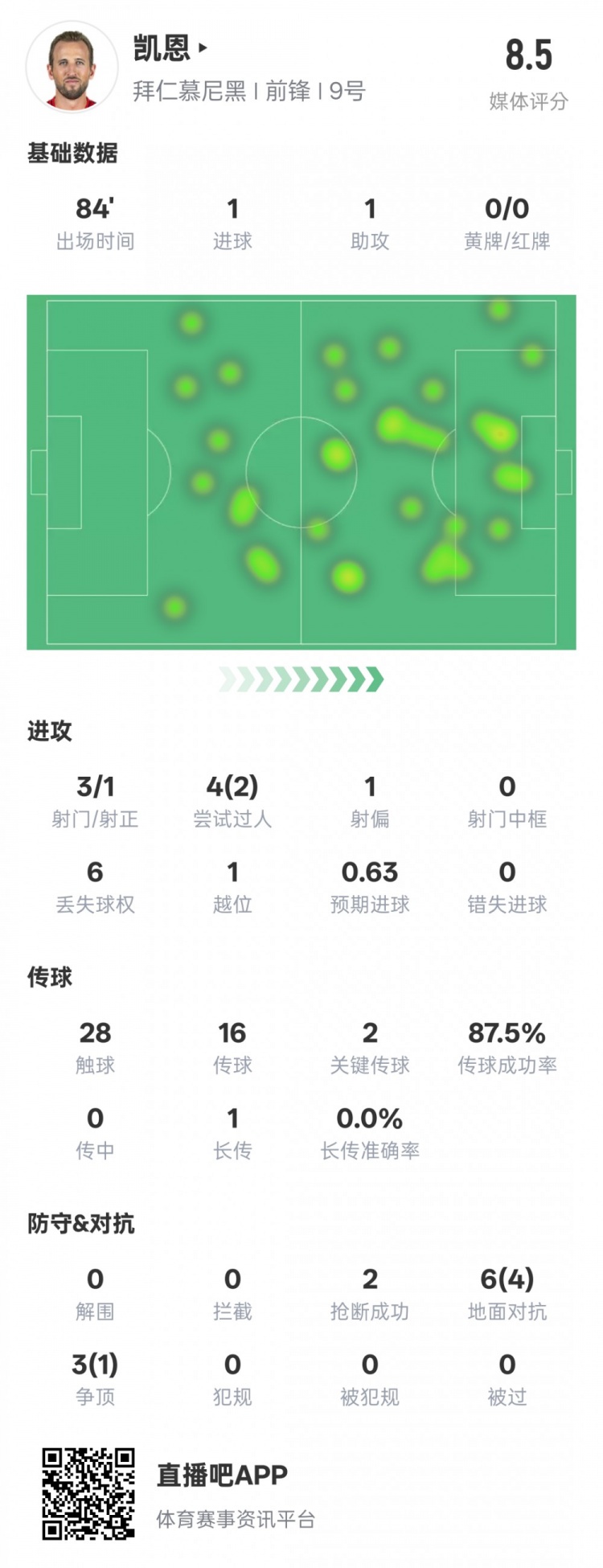 3月30日訊 德甲第27輪,拜仁對陣圣保利,凱恩首發(fā)出戰(zhàn),傳射建功,還送出2次關(guān)鍵傳球,評分8.5。