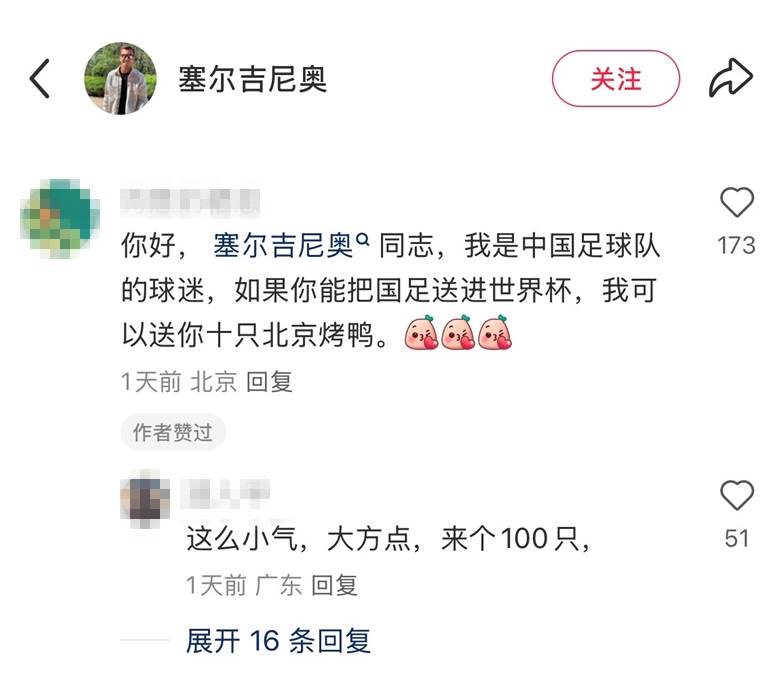 有網(wǎng)友評論:我是中國足球隊的球迷,如果你能把國足送進世界杯,我可以送你十只北京烤鴨。