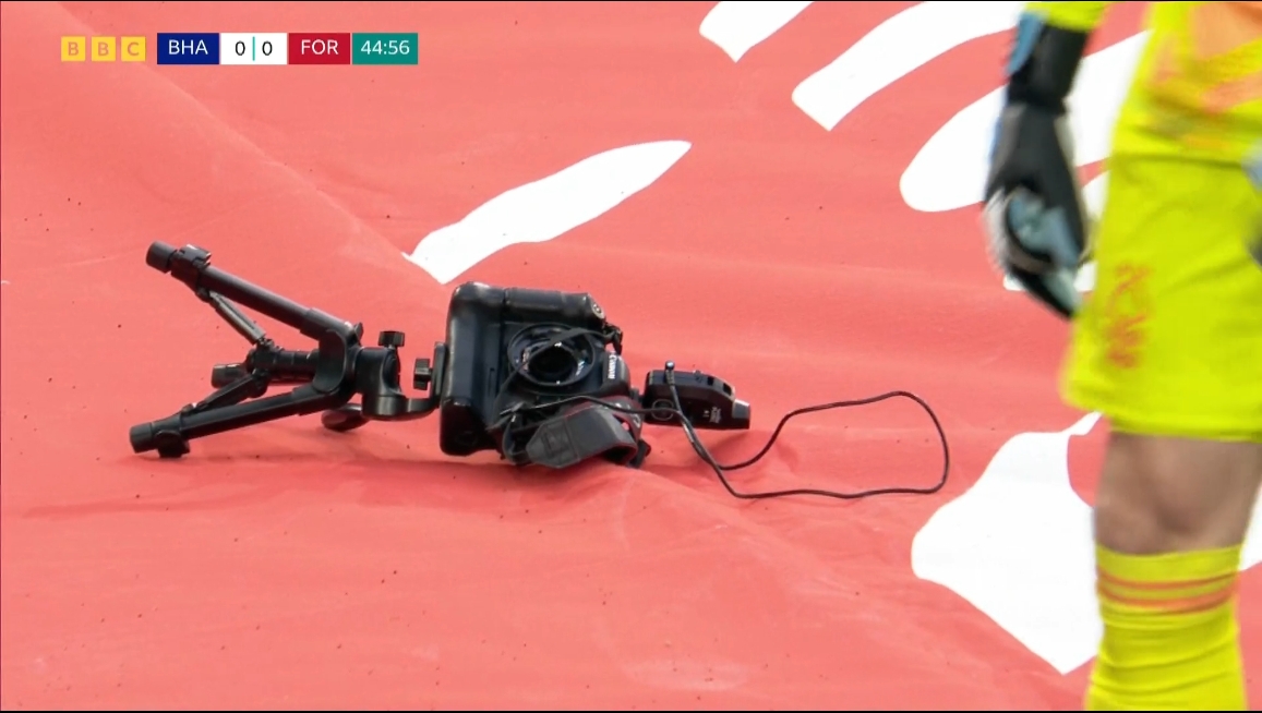 03月30日訊 布萊頓vs森林上半場,巴萊巴禁區(qū)前一腳大力爆射,打門偏了,但這腳射門擊中了場邊的相機,倒霉的相機直接被干碎。
