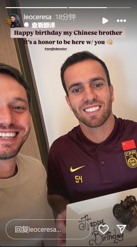 今天是國腳塞爾吉尼奧的30歲生日,他已經(jīng)抵達(dá)迪拜與國足會(huì)合并參與合練,萊奧-切雷薩曬出與塞爾吉尼奧的合影,并配文:生日快樂,我的中國兄弟,很榮幸和你一起出現(xiàn)在這里。