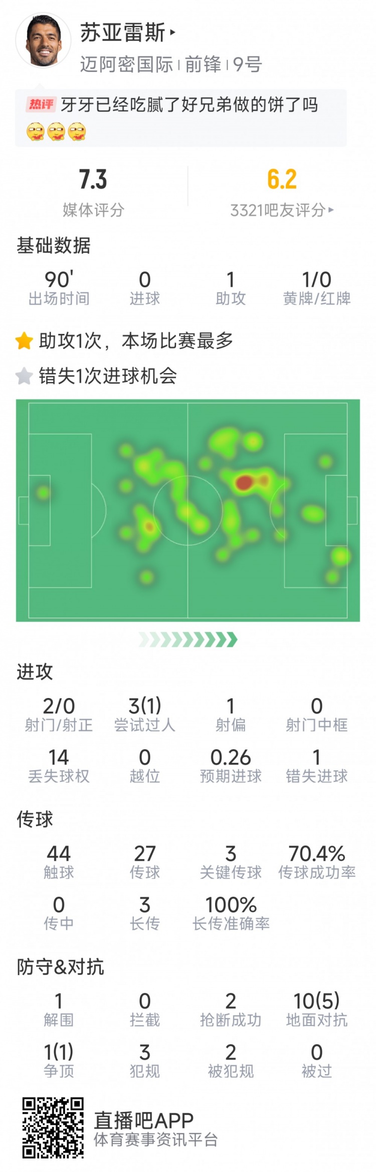 邁阿密國際官方宣布,蘇亞雷斯當(dāng)選本場比賽邁阿密隊內(nèi)最佳球員。蘇亞雷斯本賽季至今為邁阿密出戰(zhàn)9場比賽,打進(jìn)4球,助攻6次。