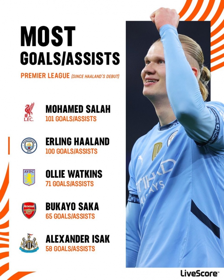 3月15日訊 曼城在本輪英超2-1領(lǐng)先布萊頓,哈蘭德點射解鎖個人英超參與100球里程碑,同期僅次于薩拉赫。