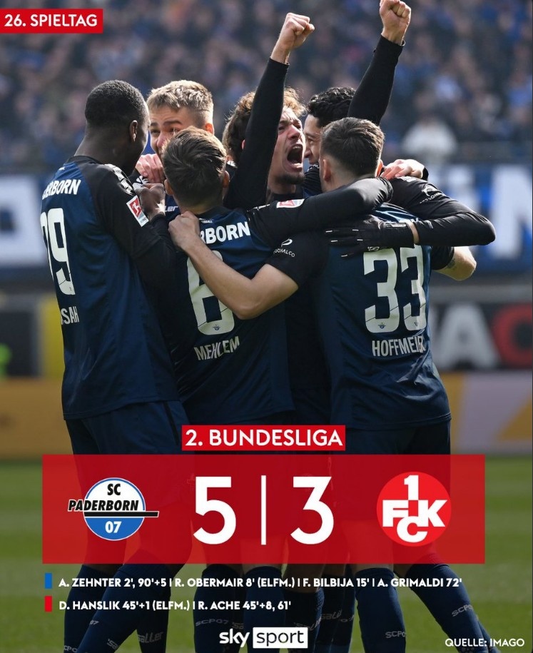 3月15日訊 在德乙第26輪一場(chǎng)強(qiáng)強(qiáng)較量中,帕德博恩5-3擊敗凱澤斯勞滕。
