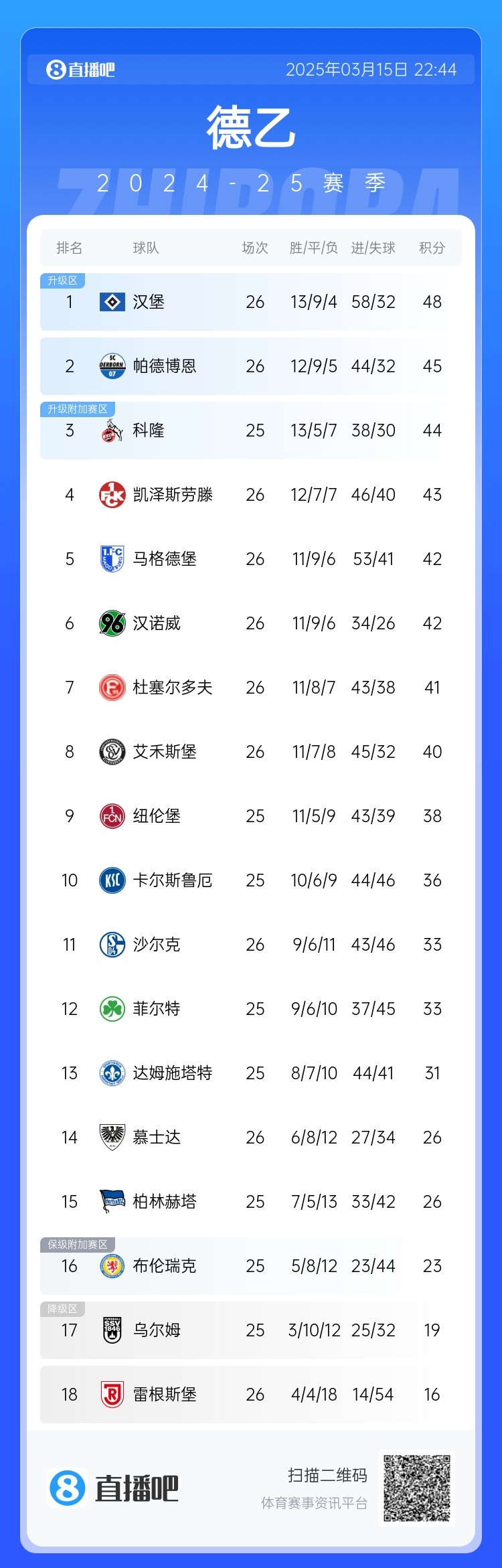 本輪過(guò)后帕德博恩反超凱澤斯勞滕升至第二位,距榜首漢堡3分。