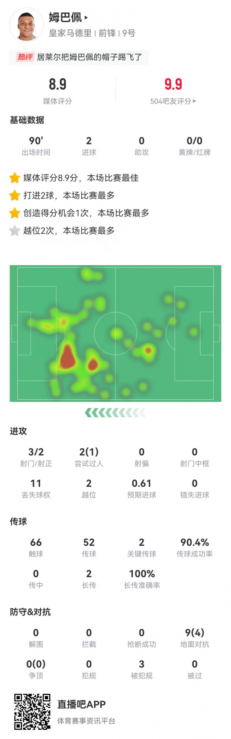 3月16日訊 皇馬在本輪西甲2-1逆轉黃潛,姆巴佩本場數(shù)據(jù)如下: