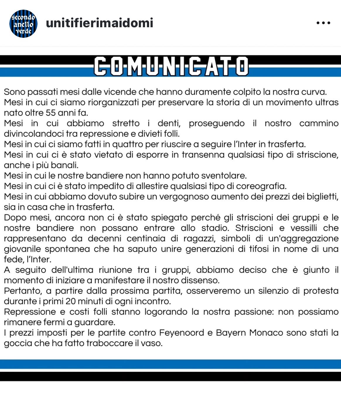 3月30日訊 國米北看臺球迷組織發(fā)布公告,宣布在之后每場比賽的前20分鐘保持沉默,抗議票價過高、主場禁止攜帶標語等情況。