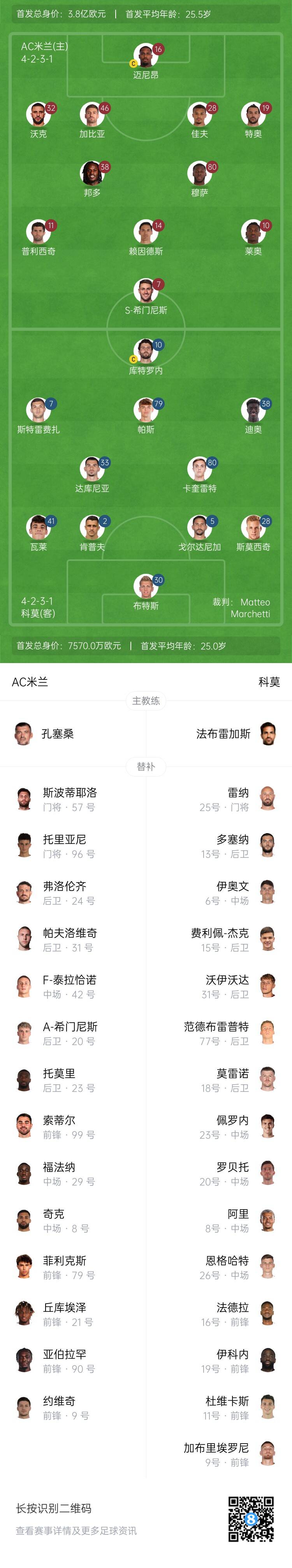 AC米蘭替補:57-斯波蒂耶洛、96-托里亞尼、24-弗洛倫齊、31-帕夫洛維奇、42-泰拉恰諾、20-希門尼斯、23-托莫里、99-索蒂爾、29-尤素夫-福法納、8-奇克、79-菲利克斯、21-丘庫埃澤、90-亞伯拉罕、9-約維奇