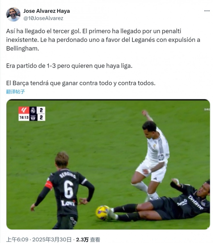 對(duì)此西班牙六臺(tái)巴薩跟隊(duì)記者Jose Alvarez Haya在社交媒體上寫道:“伯納烏的丑聞,判罰了一個(gè)不存在的點(diǎn)球(指居勒爾倒地獲點(diǎn))?!?/p>