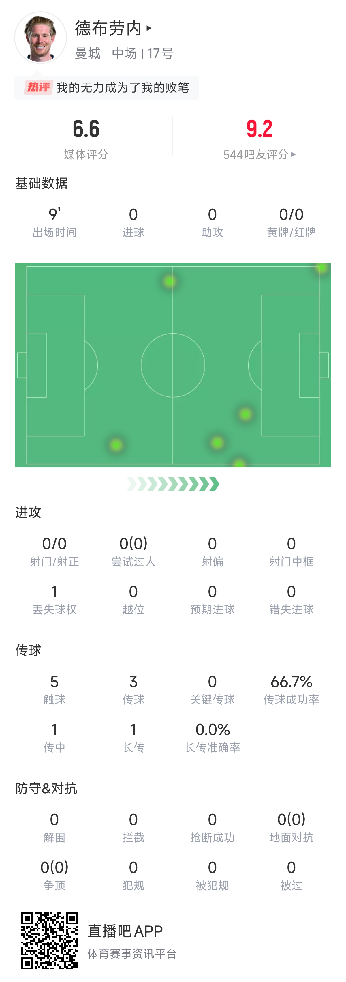 03月16日訊 英超第29輪比賽,曼城2-2戰(zhàn)平布萊頓,德布勞內(nèi)替補(bǔ)出戰(zhàn)只踢了9分鐘。