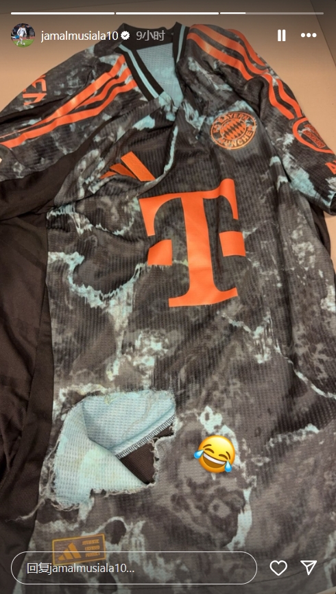 本場比賽賽后,穆西亞拉更新社媒,曬出自己球衣右側破了一個大洞的動態(tài)。