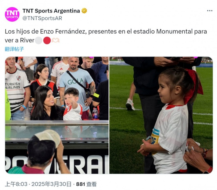 瓦倫蒂娜帶著孩子們來到紀(jì)念碑球場(chǎng),現(xiàn)場(chǎng)觀看河床隊(duì)的比賽。恩佐出身于河床青訓(xùn),他與瓦倫蒂娜去年曾分手,兩人今年1月份宣布復(fù)合。