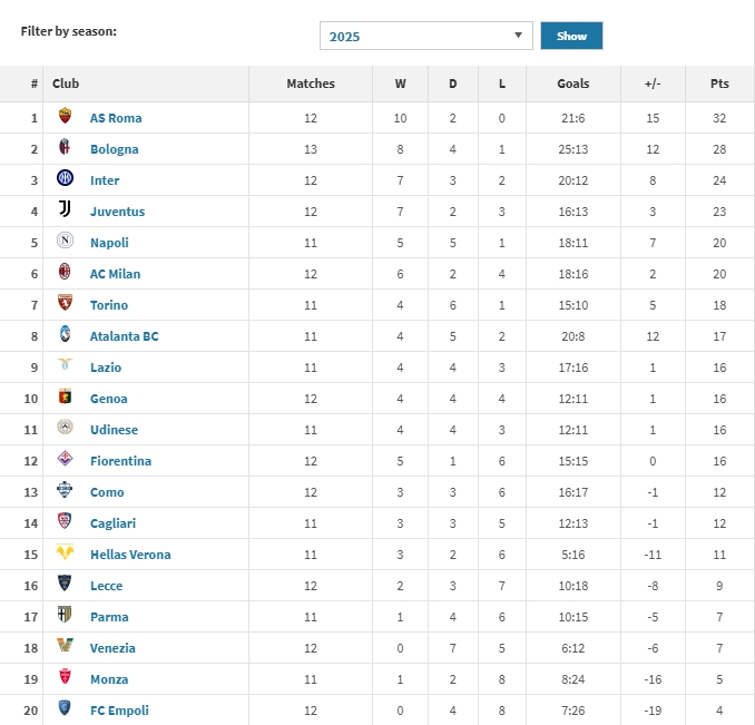 2025年以來,羅馬聯(lián)賽10勝2平,豪取32分最多。博洛尼亞13場拿到28分排名第二,國米12場24分第三。