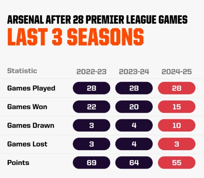 數(shù)據(jù)網(wǎng)站OPTA也盤點(diǎn)了阿森納近三個(gè)賽季28輪過后積分情況對(duì)比,具體如下: