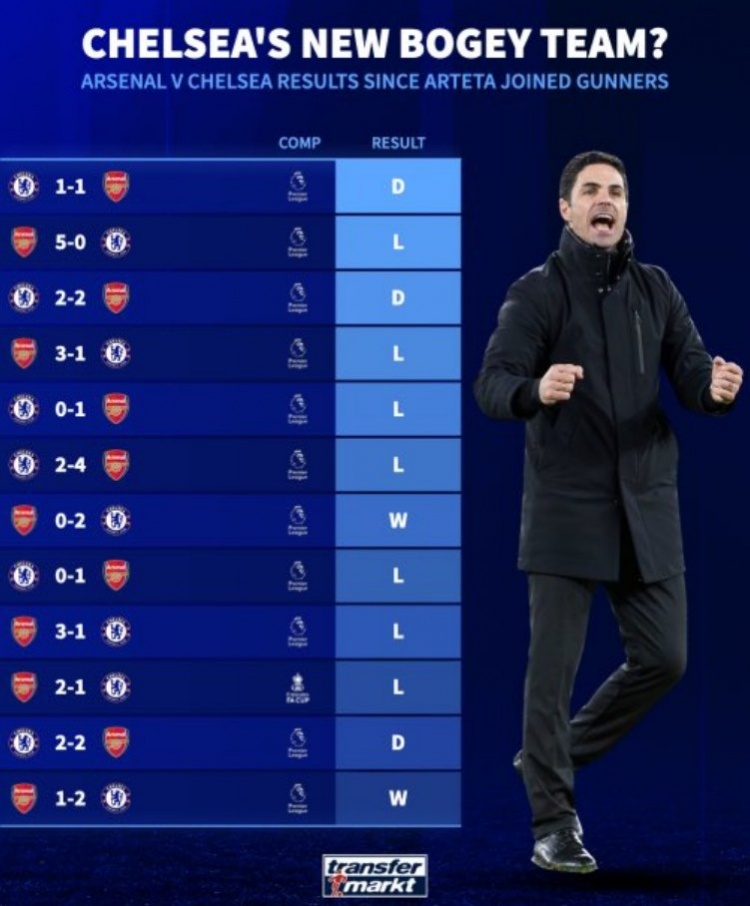 據(jù)統(tǒng)計,在阿爾特塔執(zhí)教阿森納以來,球隊在各項賽事共12次與切爾西交鋒,戰(zhàn)績?yōu)?勝3平2負,其中近6場比賽4勝2平保持不敗。