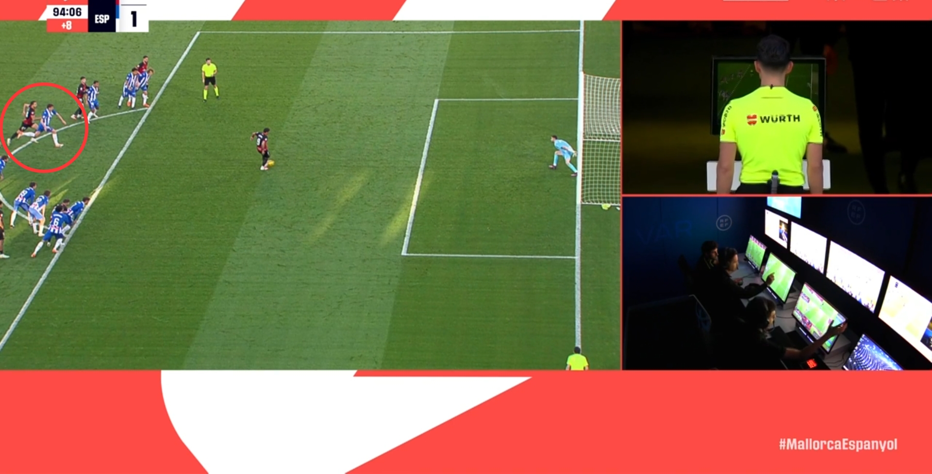 第92分鐘,VAR介入,主裁親自查看回放,此前西班牙人球員和馬略卡球員同時(shí)提前進(jìn)入禁區(qū)?。ň嚯x點(diǎn)球點(diǎn)不滿9.15米),并對比賽產(chǎn)生影響,主裁判罰點(diǎn)球重罰↓