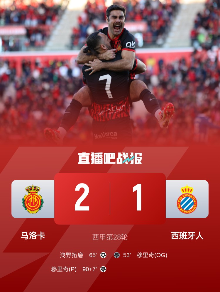 下半場補(bǔ)時(shí)8分鐘,最終踢到第102分鐘結(jié)束,馬洛卡2-1逆轉(zhuǎn)西班牙人。