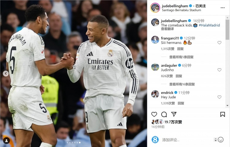 貝林厄姆社媒曬出與姆巴佩的合照,慶祝球隊取勝,配文:“逆轉(zhuǎn)兄弟團(tuán)!Hala Madrid!”