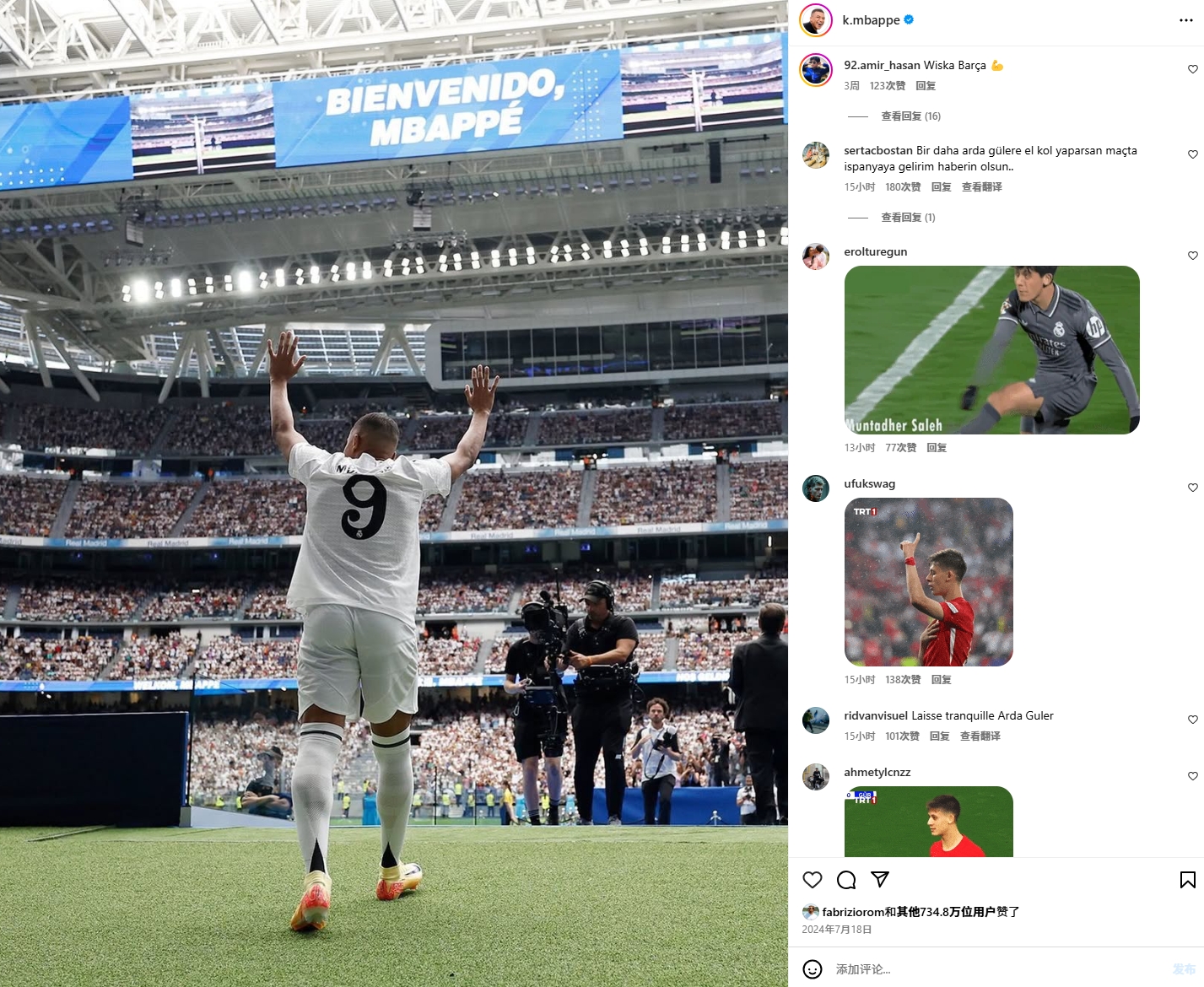 姆巴佩的社媒賽后成為居勒爾球迷的宣泄口,在姆巴佩置頂?shù)募用嘶蜀R推文中,大量土耳其球迷怒懟姆巴佩。