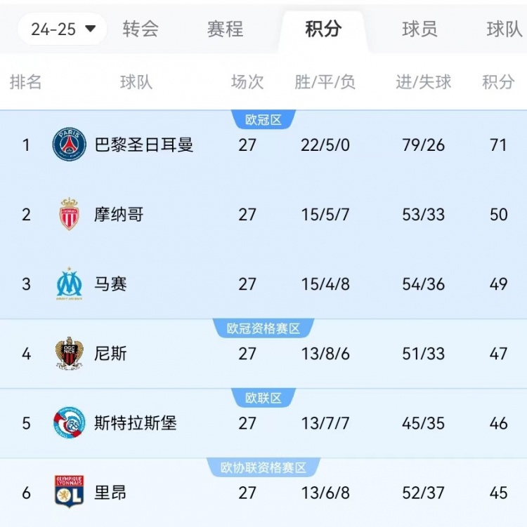 3月30日訊 巴黎在本輪法甲6-1血洗圣埃蒂安,在還剩7輪情況下領(lǐng)先第二名摩納哥多達(dá)21分+33凈勝球。