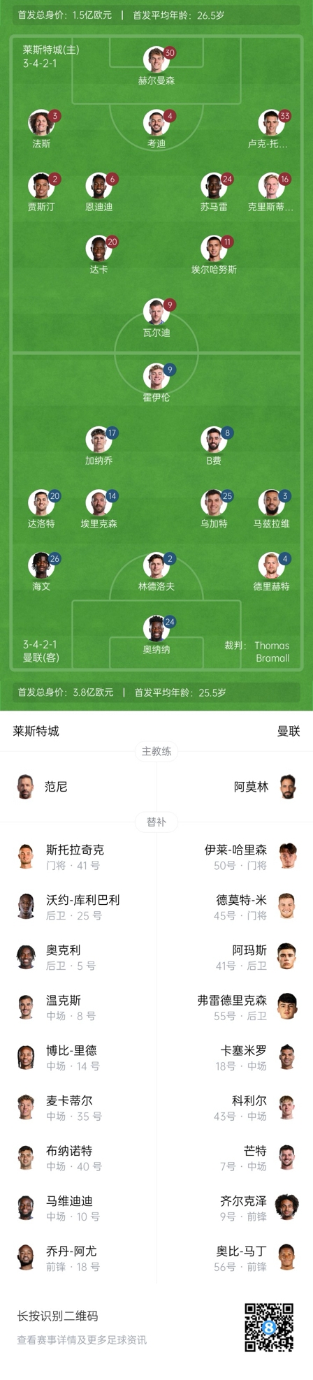 萊斯特城首發(fā):30-赫爾曼森、4-考迪、33-盧克-托馬斯、3-法斯、2-賈斯汀、16-克里斯蒂安森、6-恩迪迪、24-蘇馬磊、20-達卡、11-埃爾哈努斯、9-瓦爾迪