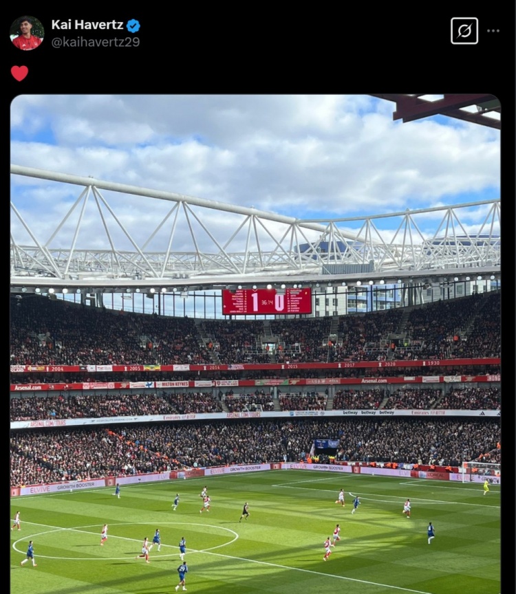 賽后,哈弗茨曬出了比分牌,慶祝阿森納擊敗自己的老東家切爾西,并配文:?。