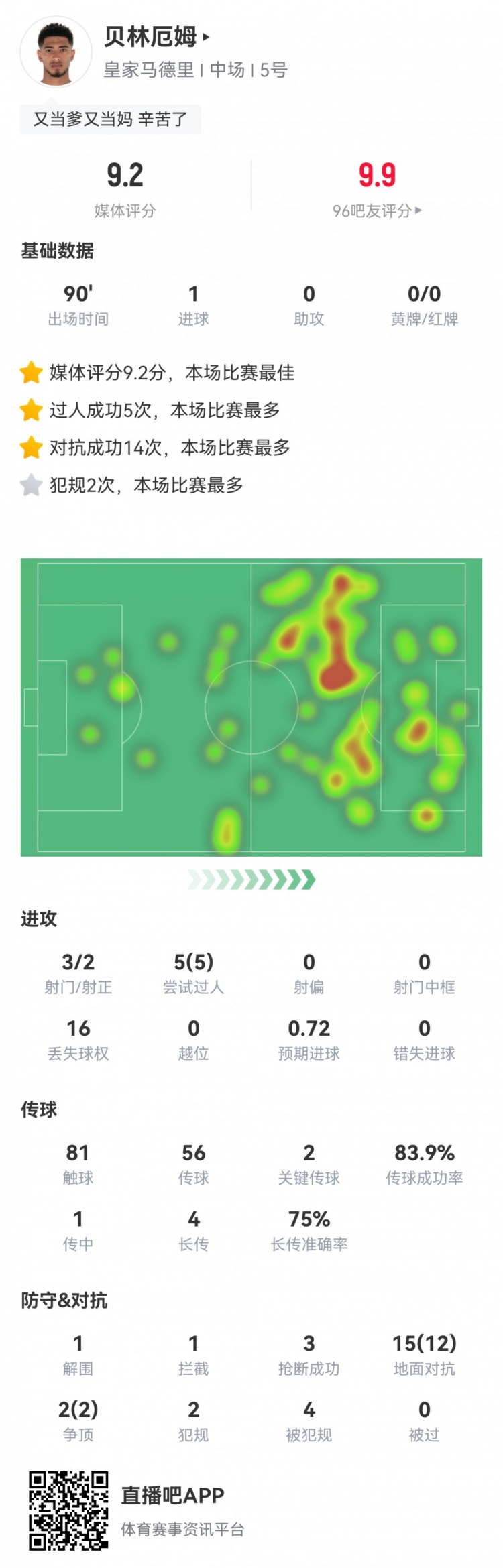 3月30日訊 本輪西甲,皇馬3-2萊加內(nèi)斯。此役貝林厄姆首發(fā)打滿全場,球員全場重點(diǎn)數(shù)據(jù)如下↓